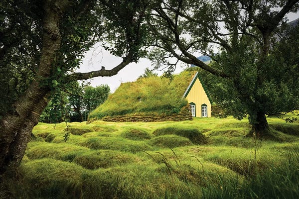 Iceland, Turf-Roofed Hof Church And Surrounding Grave Mounds.
