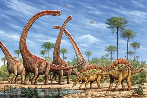 Mamenchisaurus Herd And A Pair Of Huayangosaurus Roaming By A Stream