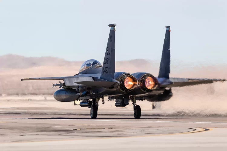 A US Air Force F-15E Strike Eagle Takes Off In Full Afterburner