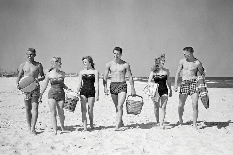 1950s Three Teenage Couples Walking On Beach Carrying Picnic Basket And CoolerVintage Images