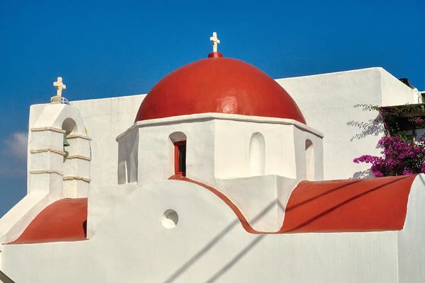 Red Dome And Bell Tower Of Greek Orthodox Church On Mykonos