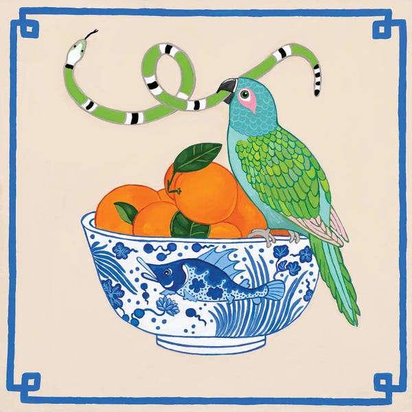 Parrot With Snakes II On Chinoiserie Fish Bowl With Oranges