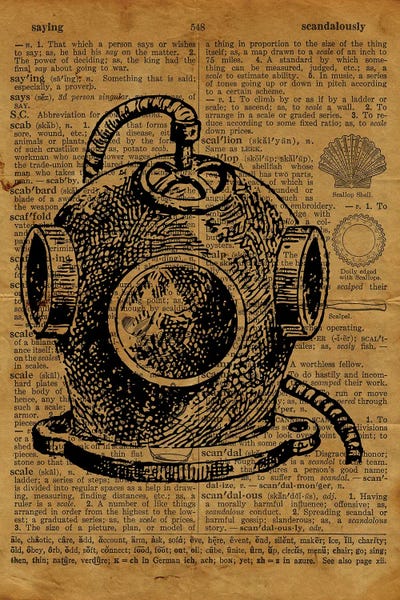 Deep Sea Diver Helmet Etching On Old Paper