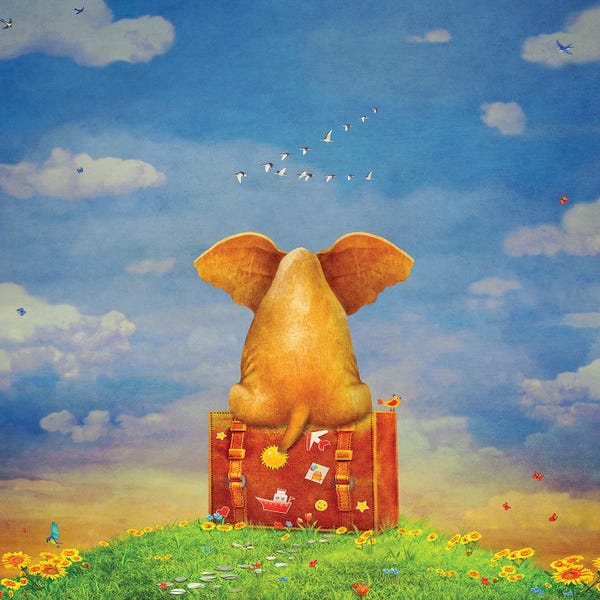 Elephant Sitting On The Suitcase On The Glade ,Illustration Art