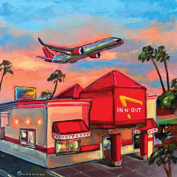 Los Angeles Cityscape With Plane. In-N-Out Burger