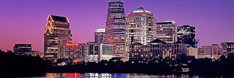 Skyscrapers lit up at sunset, Willamette River, Portland, Oregon, USAPanoramic Images