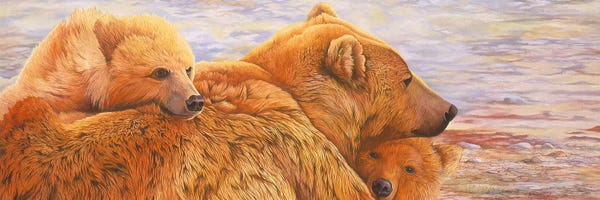 A Brown Bear Mother And Cubs Walks Across Mudflats In Kaguyak Bay, Katmai Coast, Alaska