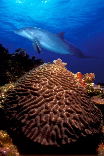 Bottle-Nosed dolphin (Tursiops truncatus) and coral in the sea