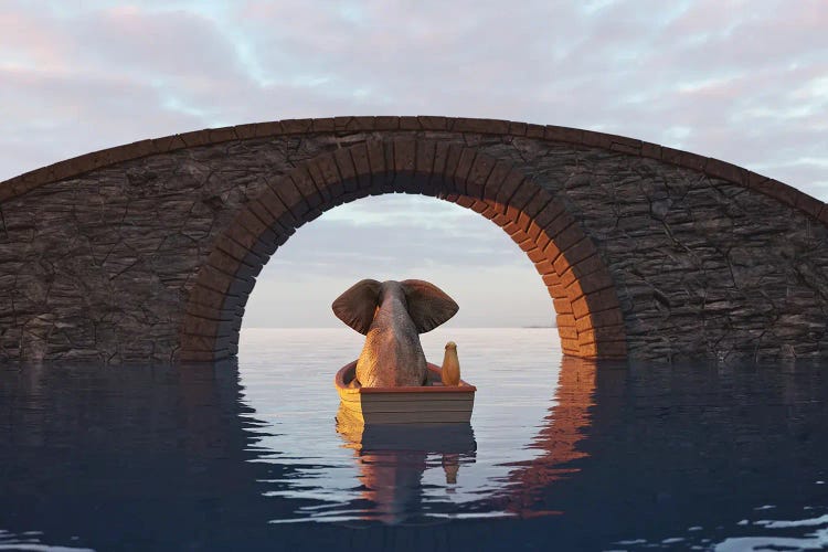 An Elephant And A Dog Are Sitting In A Flowering Field And Looking At The MoonMike Kiev
