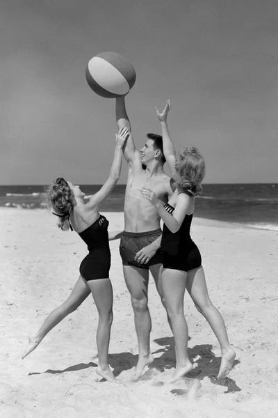 1950s Teens Jumping For Beach Ball Wearing Swim Suits