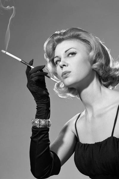1960s Sexy Sultry Woman In Black Evening Dress Long Black Gloves Bracelet Smoking Cigarette In Long Cigarette Holder
