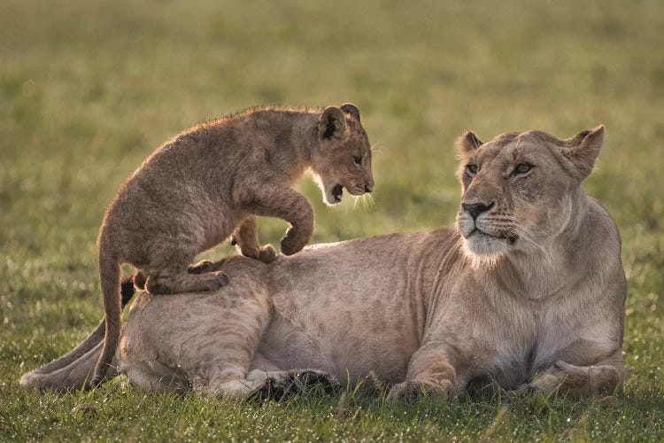 Lion Cub Playing With Lioness. Africa, Kenya, Maasai Mara National Reserve.Jaynes Gallery