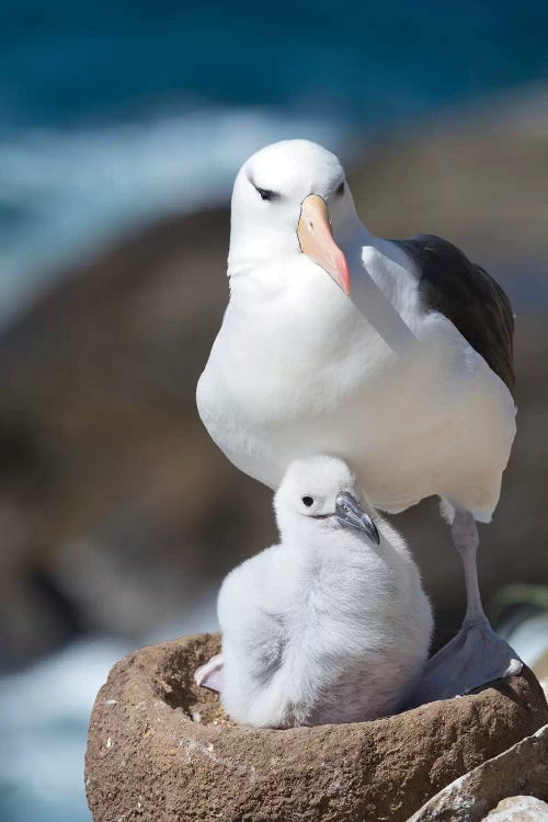 Adult And Chick Black-Browed Albatross On Tower-Shaped Nest, Falkland Islands.Martin Zwick