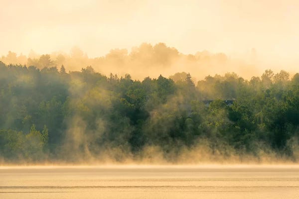 Canada, New Brunswick, Mactaquac. Morning fog on Saint John River at sunrise.Jaynes Gallery