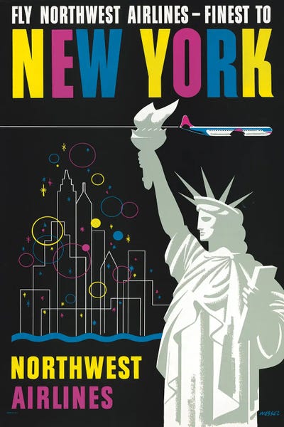 Vintage Travel Poster For Flying Northwest Airlines To New York, Showing Statue Of Liberty