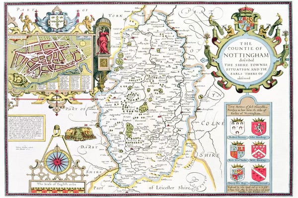 The Countie of Nottingham, engraved by Jodocus Hondius