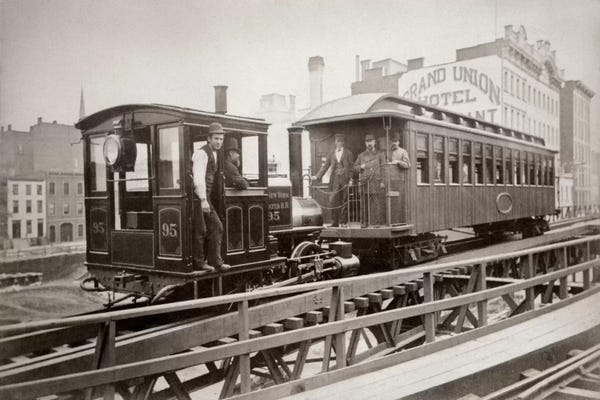 1880s Men On Board Elevated Locomotive & Passenger Car On East 42nd Street Grand Union Hotel In Background New York City USA