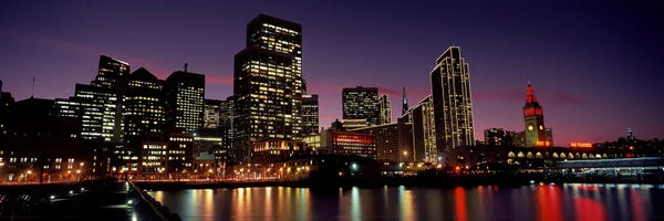 Buildings at the waterfront lit up at dusk, San Francisco, California, USAPanoramic Images