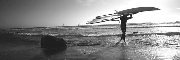 Man carrying a surfboard over his head on the beach, Santa Cruz, California, USAPanoramic Images