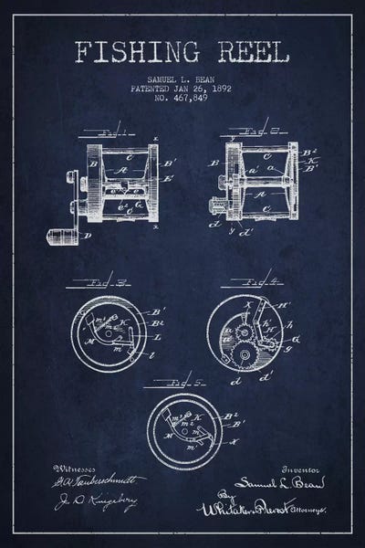 Fishing Reel Navy Blue Patent Blueprint