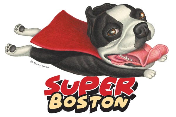 Boston Terrier Flying in Red Cape
